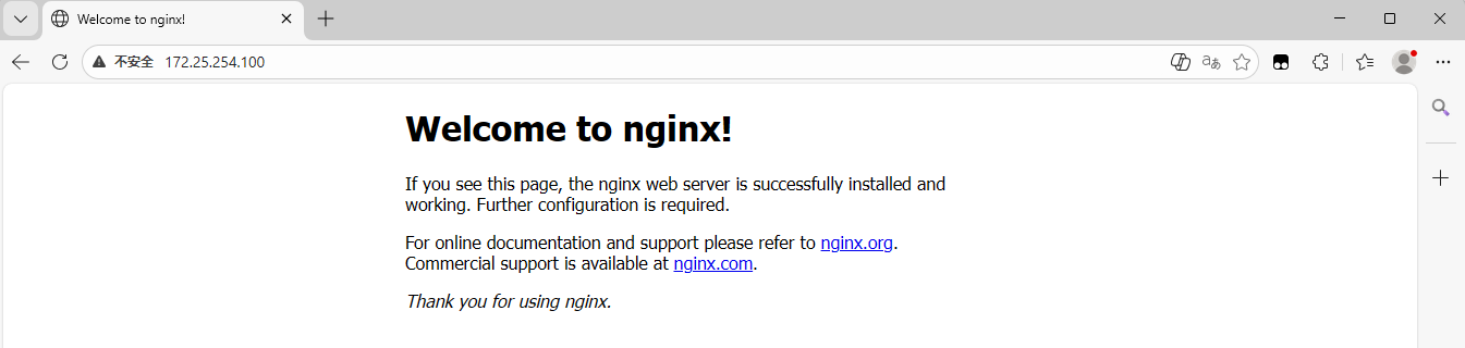打开浏览器,访问服务器IP(如http://172.25.254.100),显示Nginx默认欢迎页。