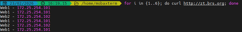 多次访问http://zt.brs.org,浏览器交替显示Web1 - 172.25.254.101和Web2 - 172.25.254.102(轮询算法)。
