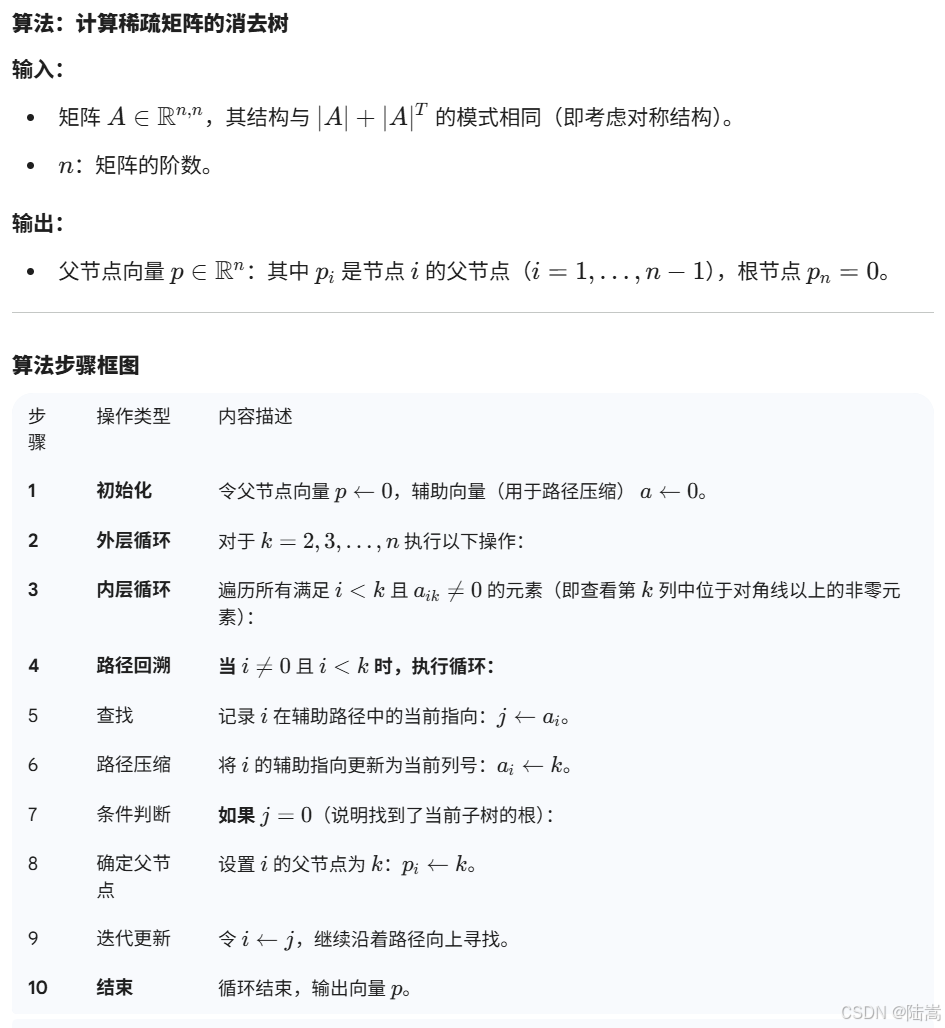 消去树是一种树结构,描述非零元素依赖关系的树状结构。通常,节点 jjj 的父节点为 L 的第 jjj 列中,主对角线以下非零行索引里最小的那个行号 。它表示列 jjj 在后续计算中,最先会被需要到哪一列(更大的列)。父节点 = 第一个需要我(子节点)提供数据的"上级"。