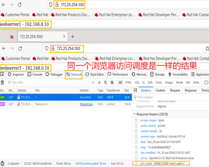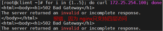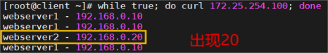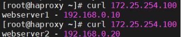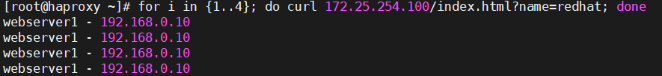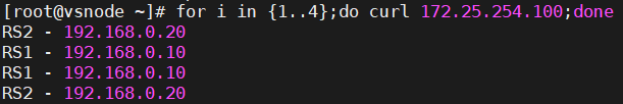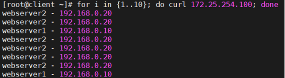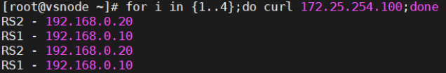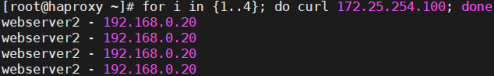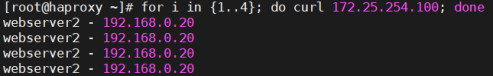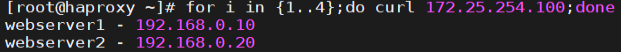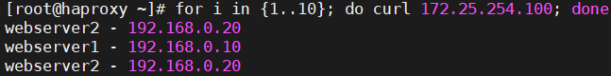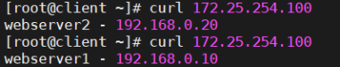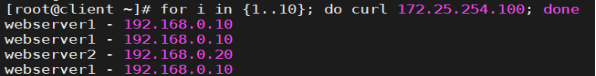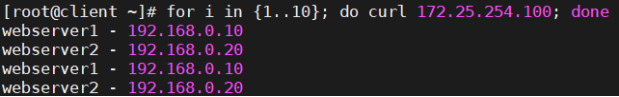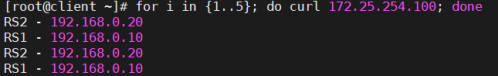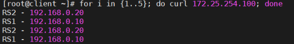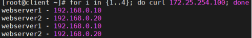 # for i in {1..5}; do curl 172.25.254.100; done 查看结果: