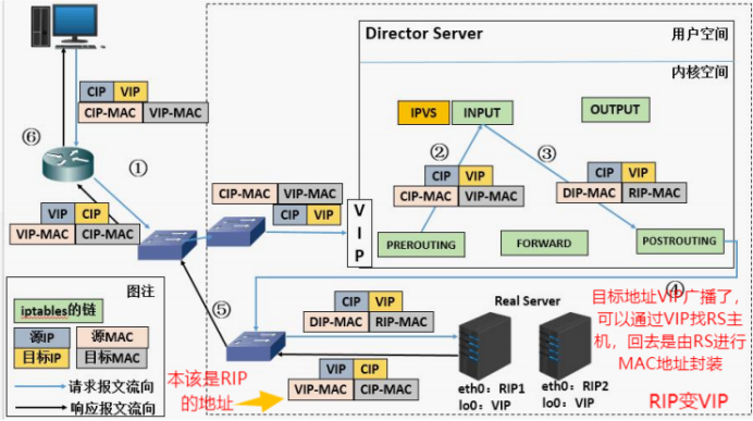 RS收到的请求报文源地址是DIP,因此,只需响应给DIP;但Director还要将其发往Client