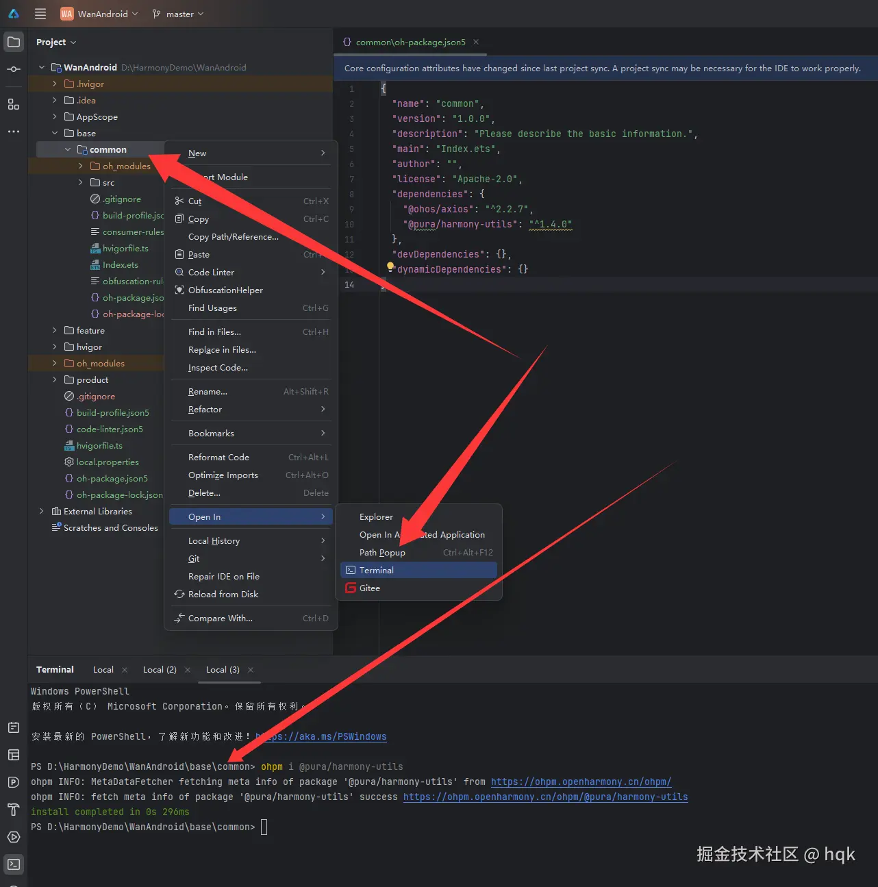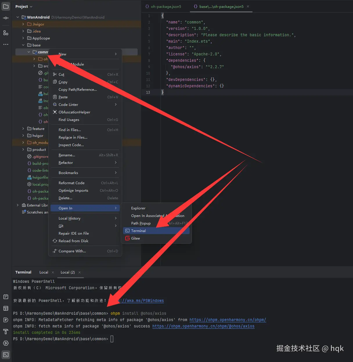 base/common目录下的oh-package.json5中操作。 - 执行安装: 在该目录下运行