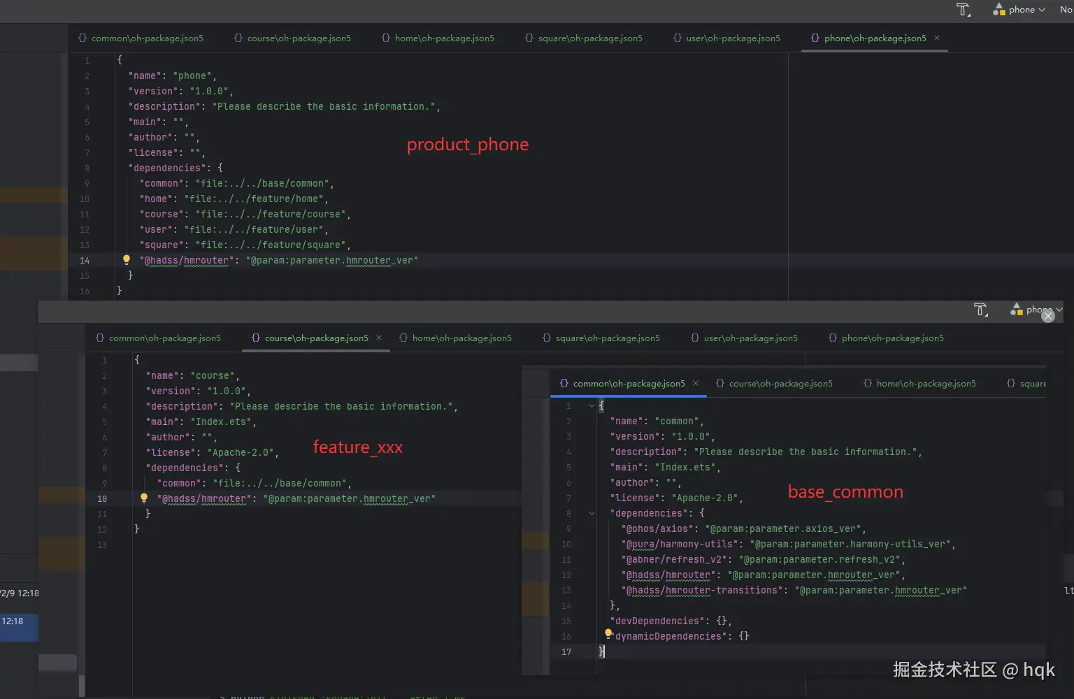 而在product下的phone下根目录oh-package.json5文件里添加如下代码