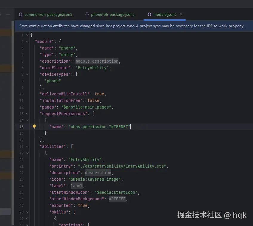 base_common需要用到axios,来进行二次封装,你就必须在这个模块下的oh-package.json5中声明。 - 定义模块属性: 定义当前模块的名字(name)、版本(version)。