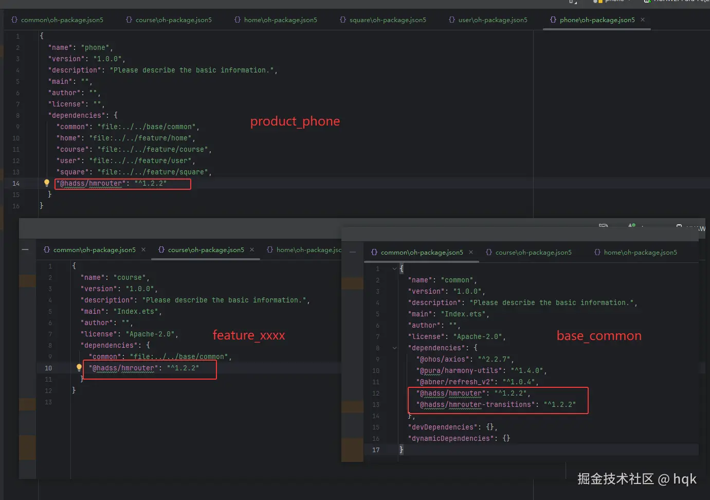 随着项目规模的扩大,base_common、feature_home 等多个模块可能会重复引用同一批三方库。如果版本号散落在各个模块的 oh-package.json5 中,后期升级时极易出现"漏改"或"版本冲突"的情况。