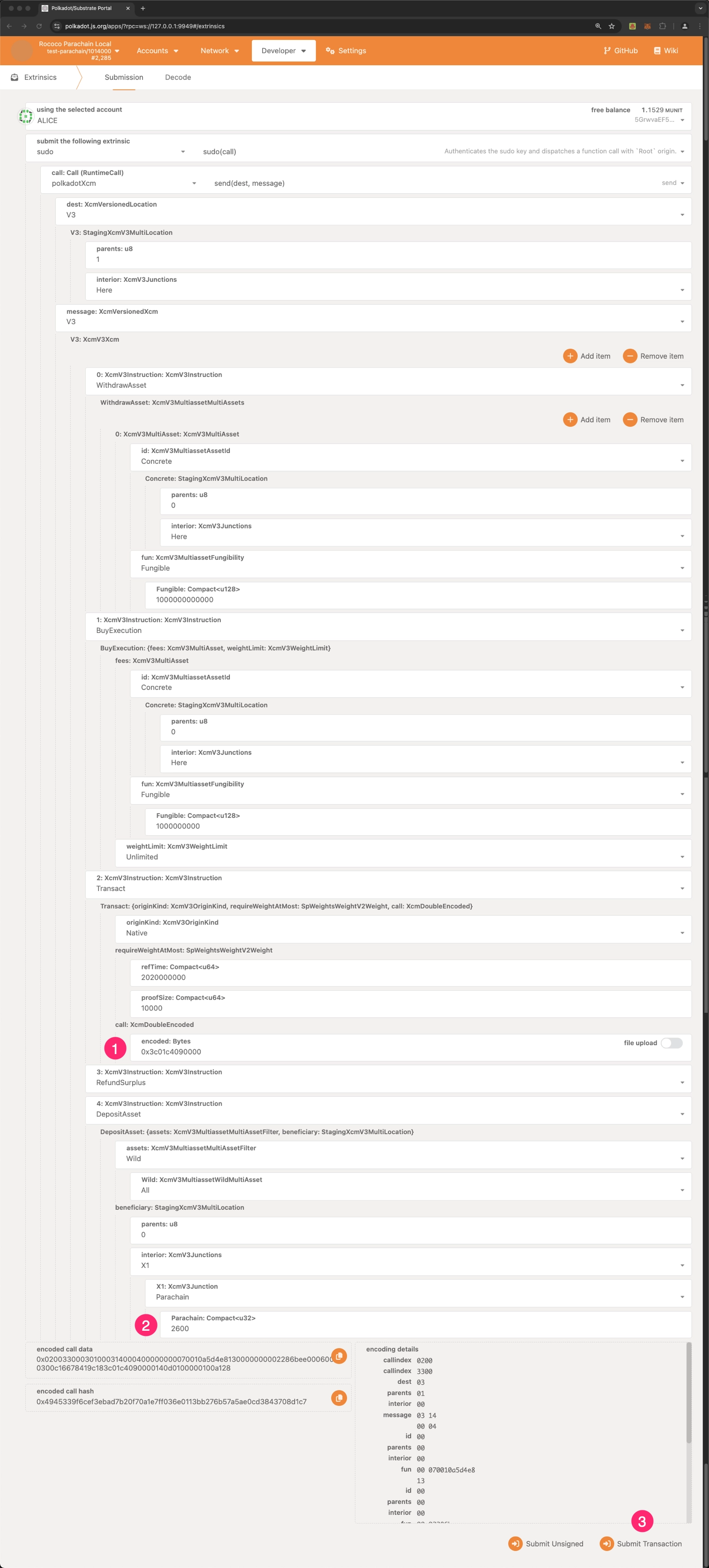 在 polkadotXcm.send 中填入 encoded call