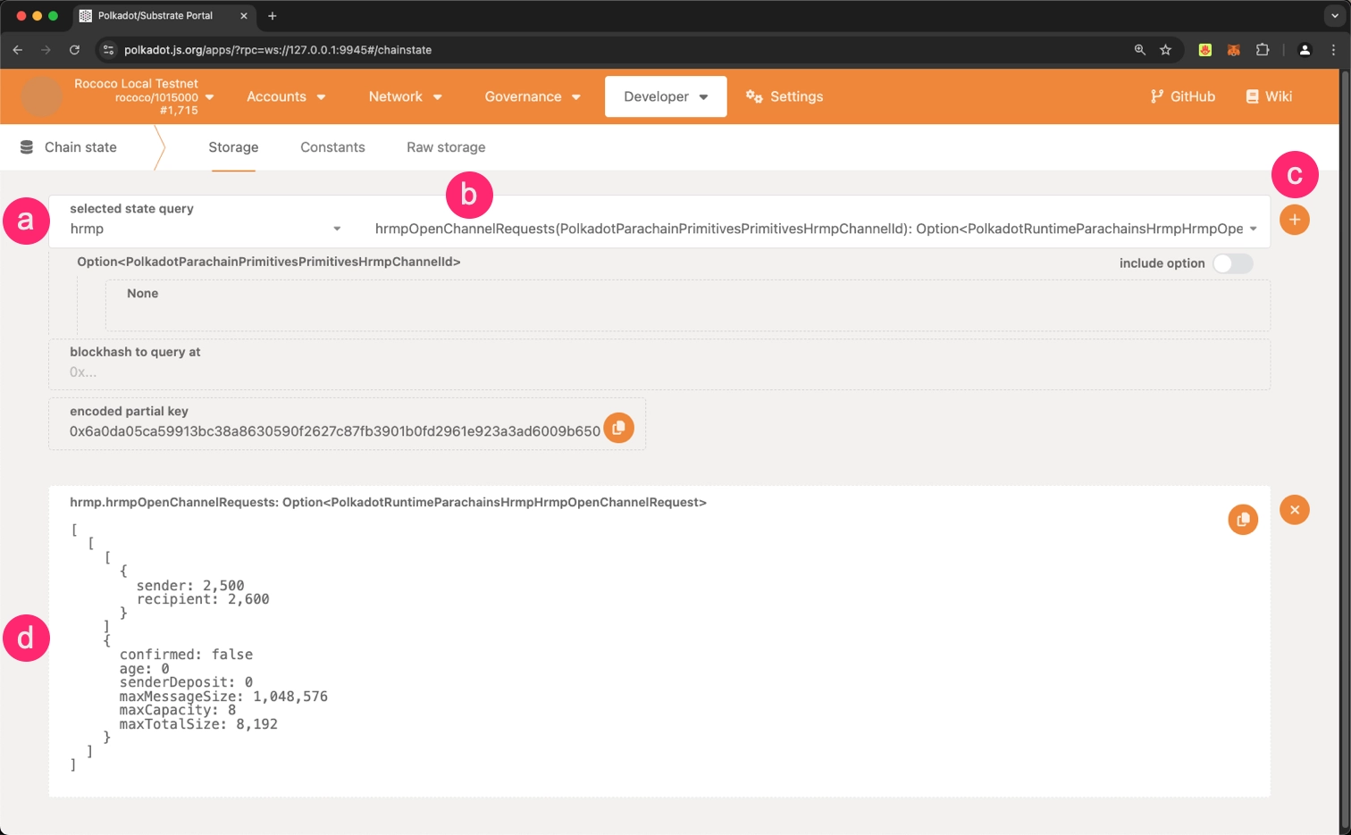 你会看到 2500 → 2600 的待处理请求。这说明:Relay Chain 已记录你的通道申请,正在等待对方同意。