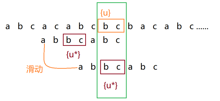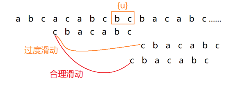 - 若上述情况均不满足,直接将模式串滑动到主串中{u}的后方,跳过所有与{u}重合的位置。