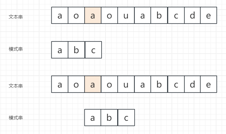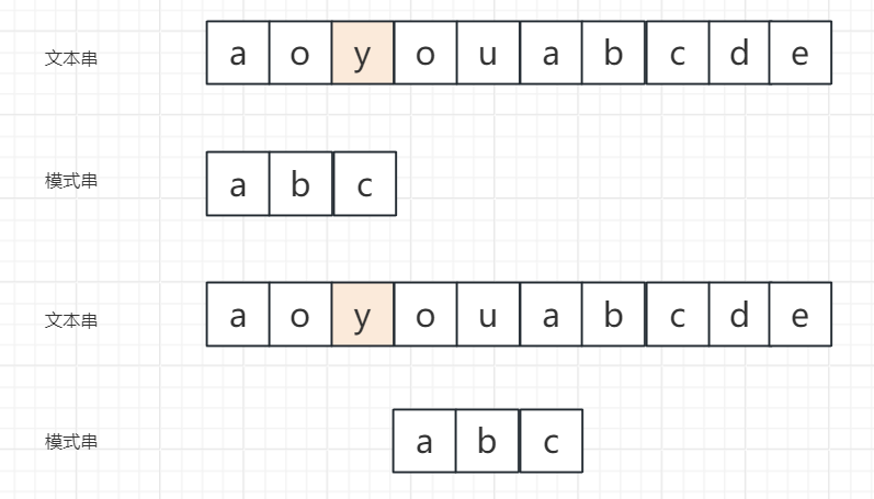 示例1:坏字符在模式串中不存在(以主串aoyouabcde、模式串abc为例)
