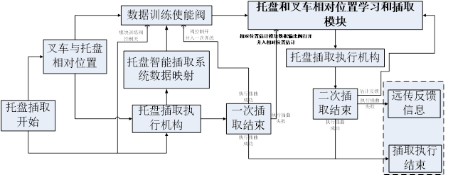 叉车行进至目标托盘附近,插取动作非常关键。一般都要先识别一下托盘的摆放位置,再做插取动作。具体的识别方法有很多种,主要有基于相机、基于多线激光雷达和基于RFID等方法。此处尝试了一种,依靠叉臂头部的接近开关完成识别的方法。具体操作流程如下图1所示: