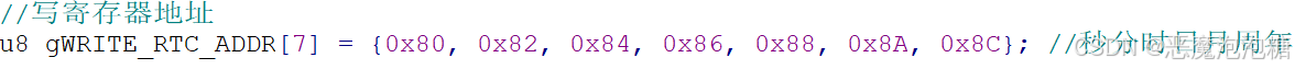 static u8 gWRITE_RTC_ADDR[DS1302_TIME_REG_NUM] = {0x80, 0x82, 0x84, 0x86, 0x88, 0x8A, 0x8C}; //秒分时日月周年