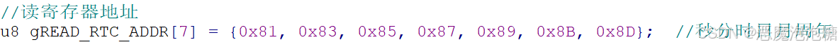 static u8 gREAD_RTC_ADDR[DS1302_TIME_REG_NUM] = {0x81, 0x83, 0x85, 0x87, 0x89, 0x8B, 0x8D}; //秒分时日月周年