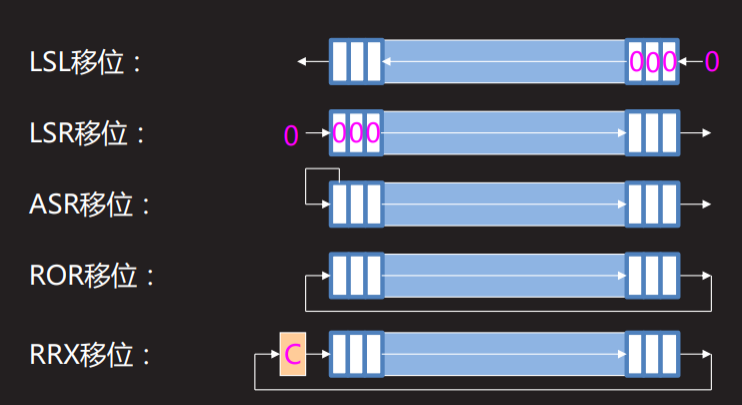 lsl{cond}{S} <Rd>, <Rm>, 立即数/寄存器 #逻辑左移 logical shift left
