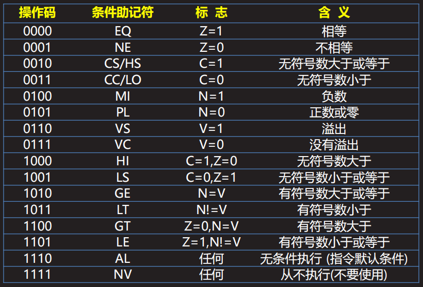 1. 共 16 种(如 eq/ne/gt/lt/al 等),默认 al(无条件执行)2. 仅当 CPSR 中条件标志位满足时,指令才执行 |