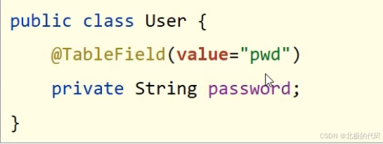 使用@TableField(value="")注解,写在模型类属性上方。value设置数据库表字段的名称。