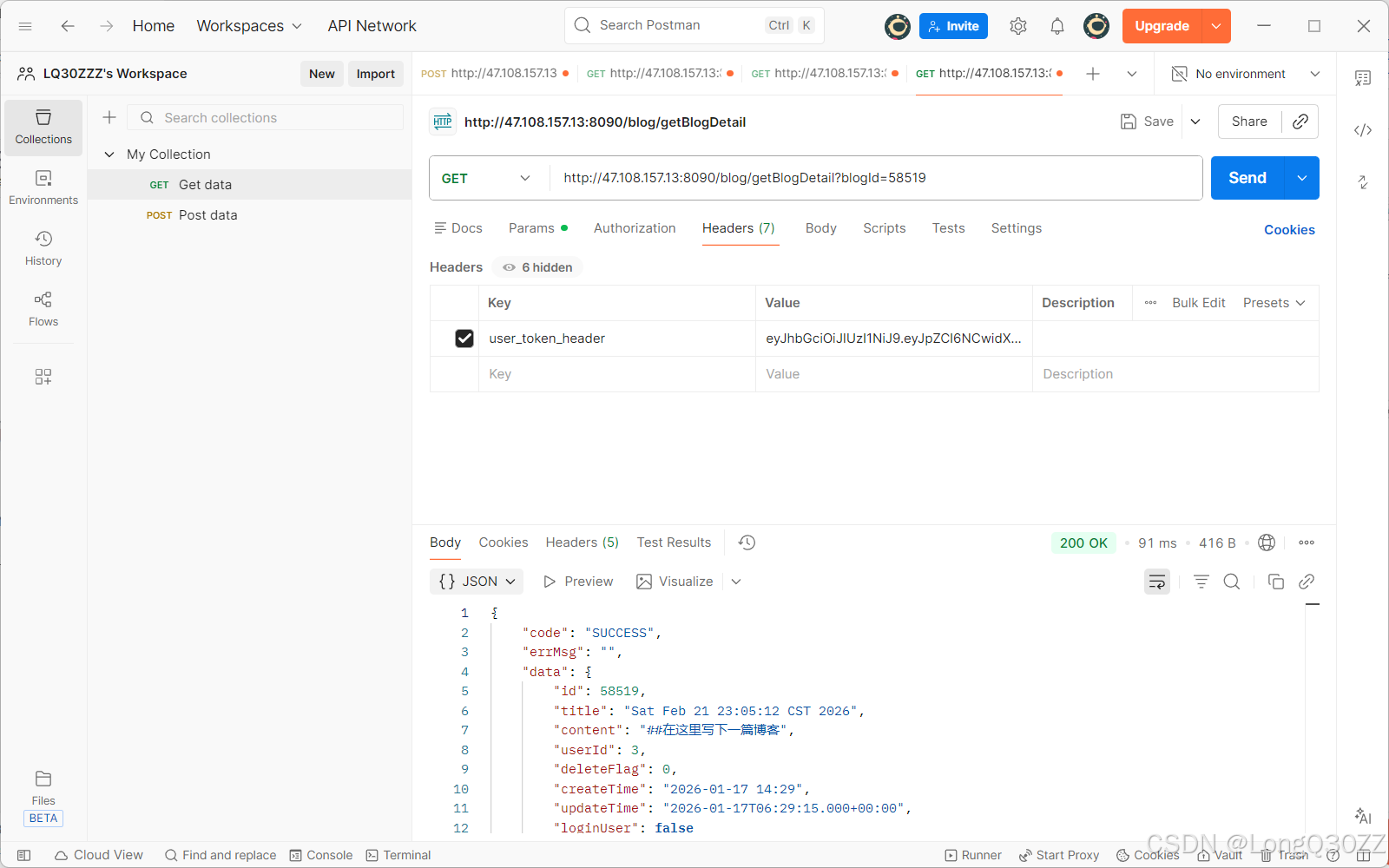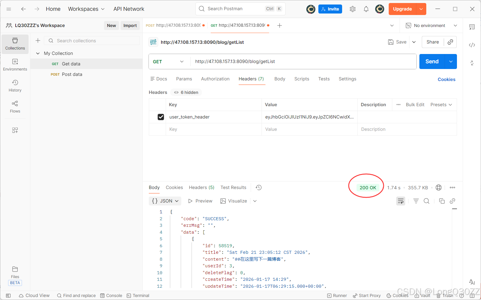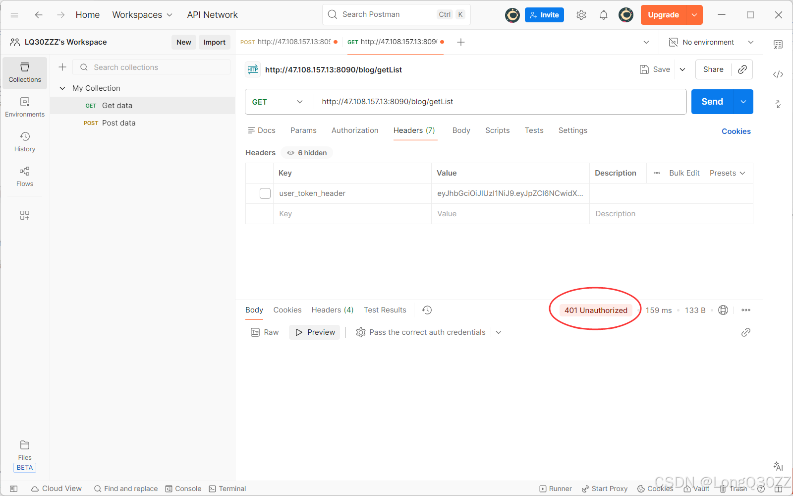 当我们要测试博客列表页时,我们要添加请求头数据,不然就会请求失败