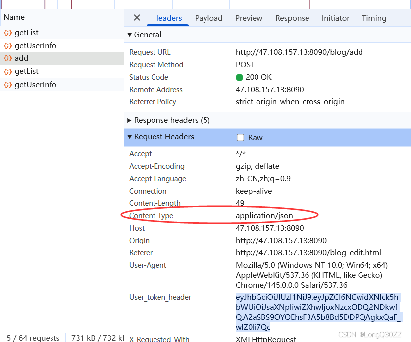 通过对比JMeter中的请求头和网页中的请求头我们可以发现我们要把JMeter中的Cintent-Type改成与网页中的一致才可以