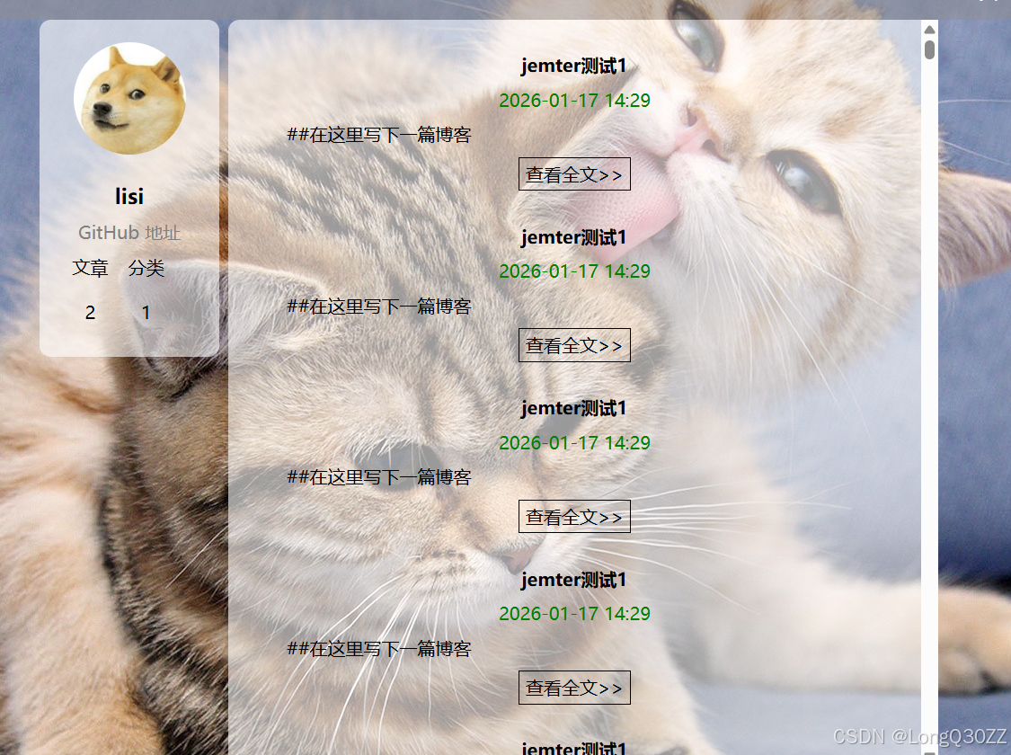 1)当我们正确的输入账号和密码,会跳转到博客列表页,在这个页面会显示你的名字和你发布博客的数量,时间,内容等