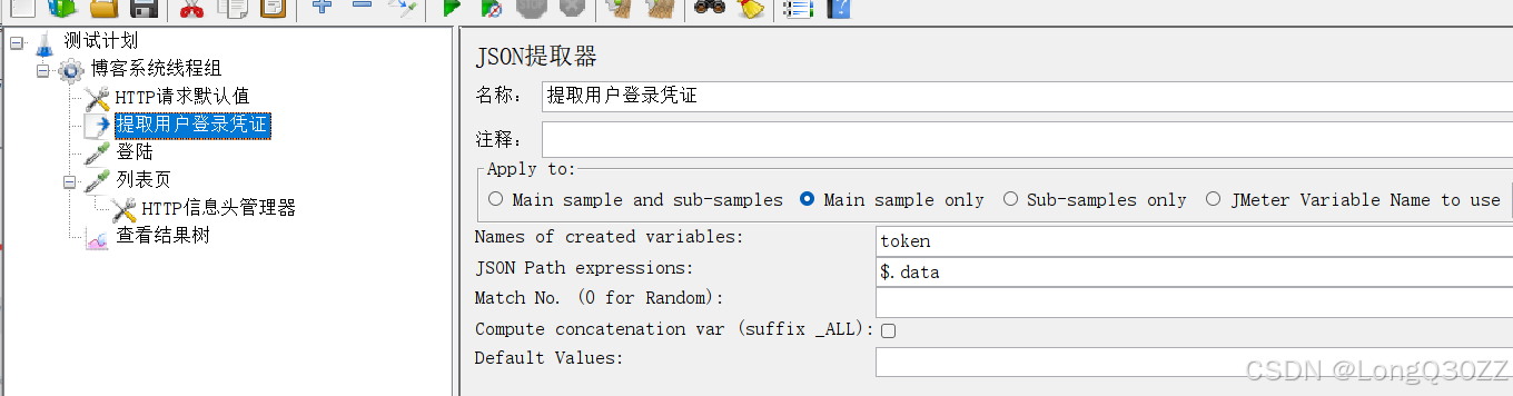 当多个接口中都有符合条件的JSON提取字段,则会发生覆盖,所以我们要把提取用户登陆凭证 这个JSON提取器放到登录 子目录下,这样提取的就是登录接口的token