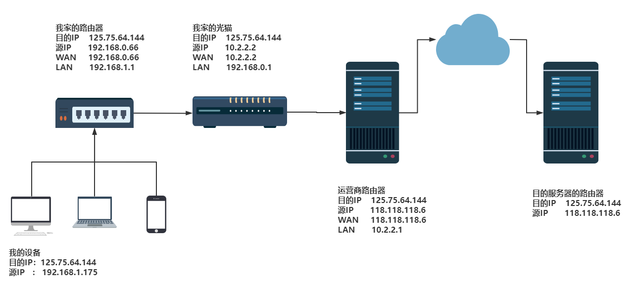 由上图可⻅,运营商的⼀个外⽹IP可以承载很多个⽹络设备上⽹