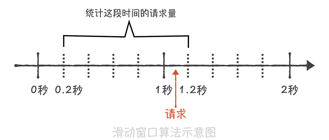 为了解决这个缺陷,就有了基于滑动窗口的算法。 这个算法的原理是将时间的窗口划分为多个小窗口,每个小窗口中都有单独的请求计数。比如下面这张图,我们将 1s 的时间窗口划分为 5 份,每一份就是 200ms;那么当在 1s 和 1.2s 之间来了一次新的请求时,我们就需要统计之前的一秒钟内的请求量,也就是 0.2s~1.2s 这个区间的总请求量,如果请求量超过了限流阈值那么就执行限流策略。