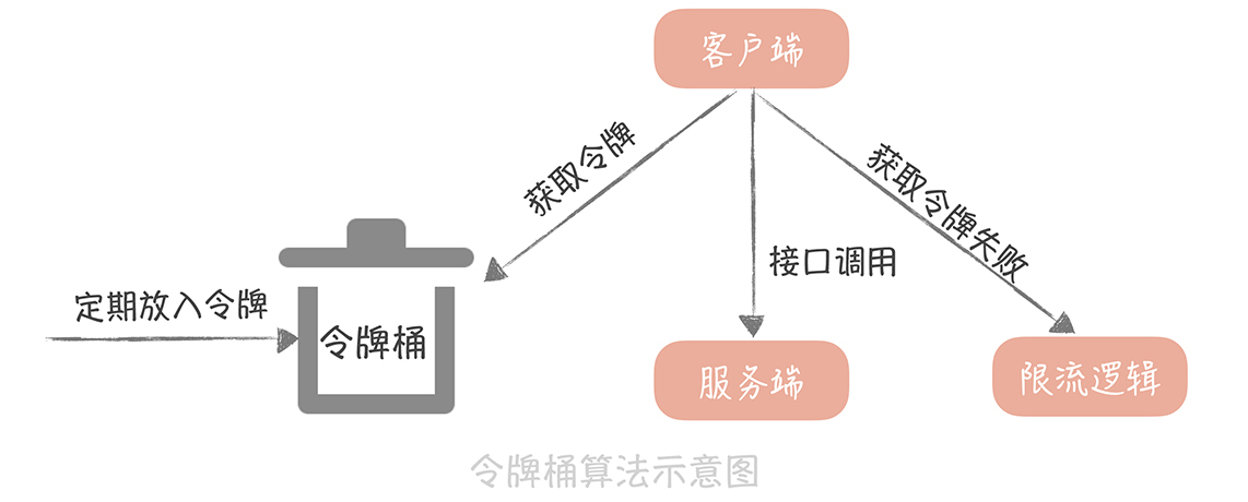 在处理请求之前先要从桶中获得一个令牌,如果桶中已经没有了令牌,那么就需要等待新的令牌或者直接拒绝服务;