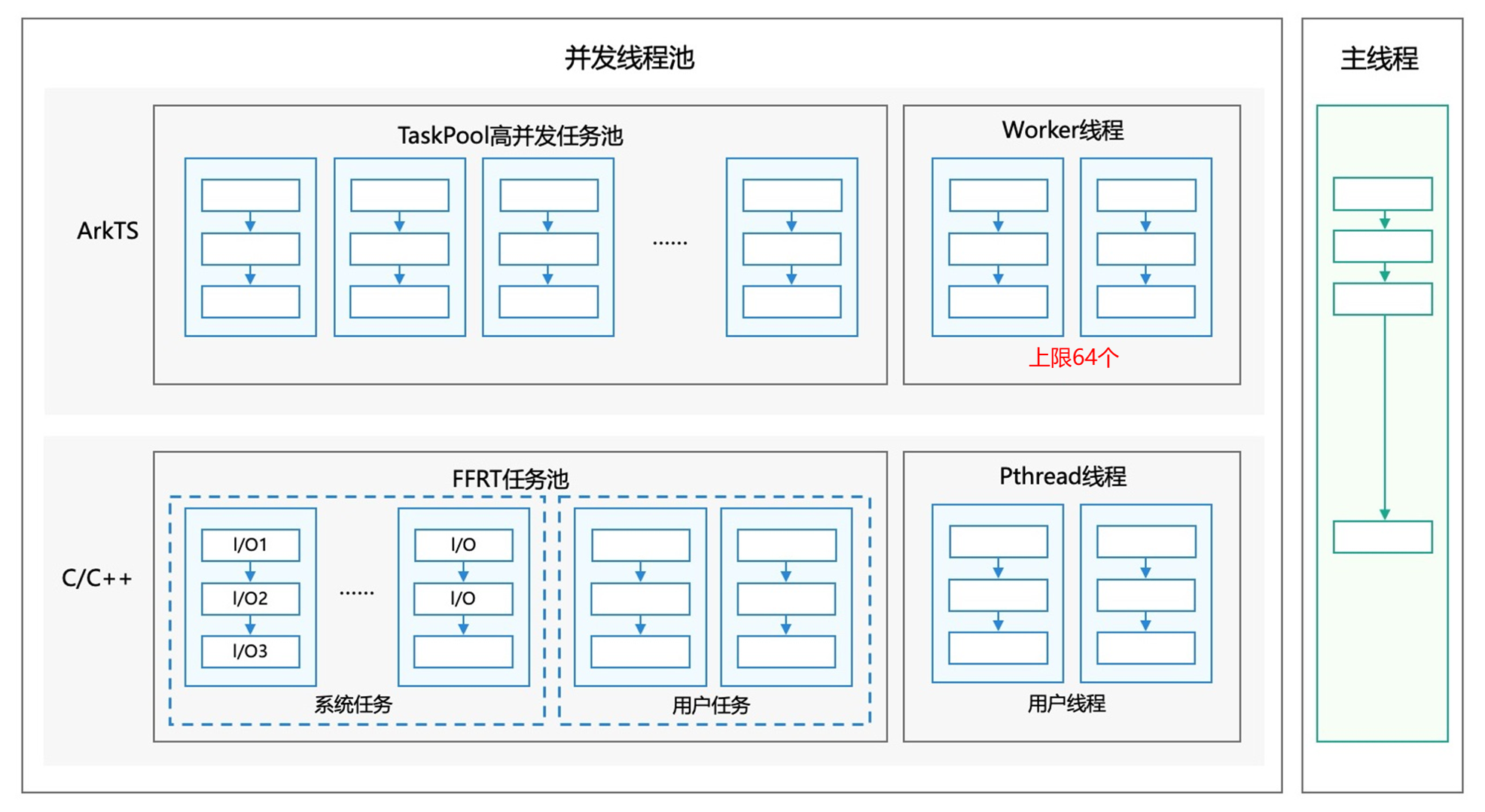 - 主线程:执行UI业务、不耗时操作、单次I/O任务,与其他ArkTS线程共享系统I/O线程池