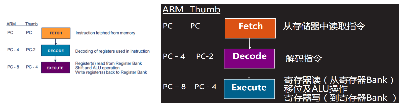 - Thumb状态,执行Thumb指令(16bit)