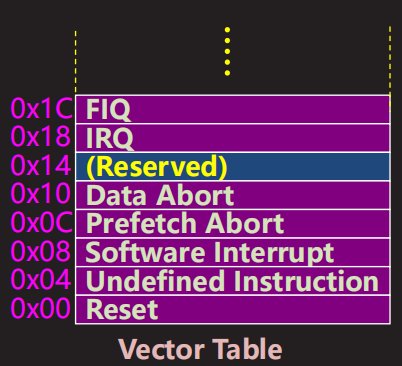 - 该条指令只能是放跳转指令,当异常产生时,跳转到该位置, 而该位置上存储的也是一条跳转指令,使得继续跳转到更广阔的空间,在该广阔空间中分别放置对应异常处理代码。而存储了跳转指令的这片连续的内存就称作异常向量表了