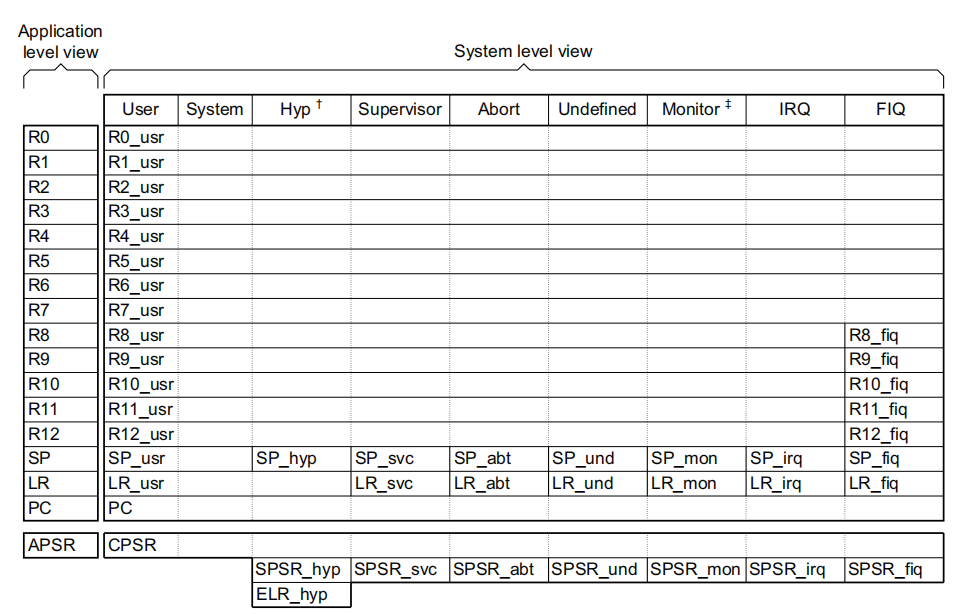 注意:System mode不是因为发生了某种异常处理器自动进入的模式,而是异常处理函数通过修改CPSR来进入的