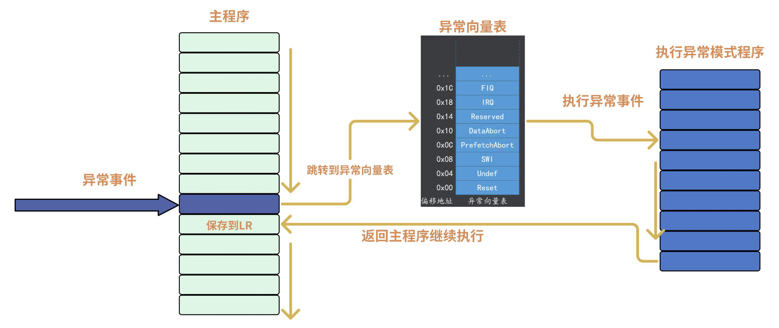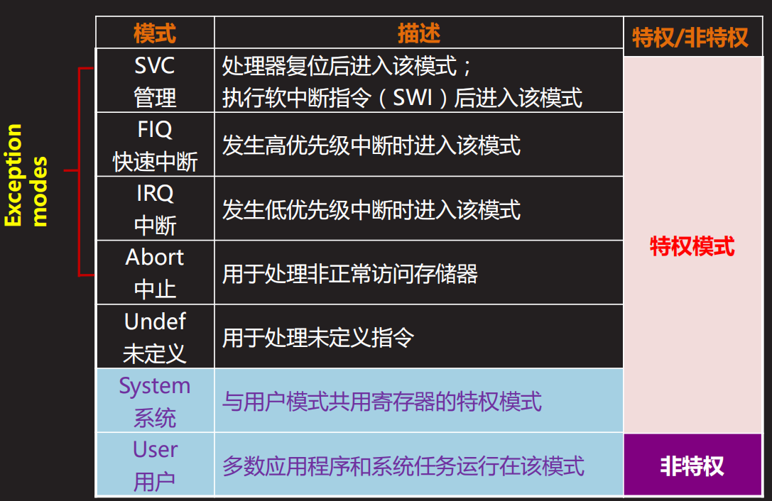 | 3. 保存返回地址 | 将异常返回地址写入对应异常模式 下的 LR_<mode>(链接寄存器) |