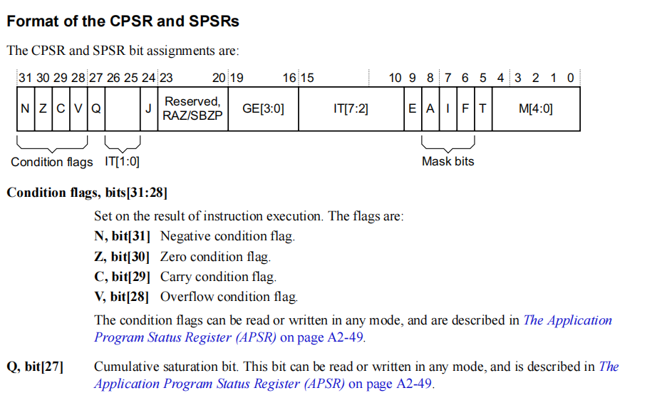 28\] V位:Overflow,对于加减法指令,在操作数和结果是有符号的整数时,如果发生溢出,则V=1,反之V=0