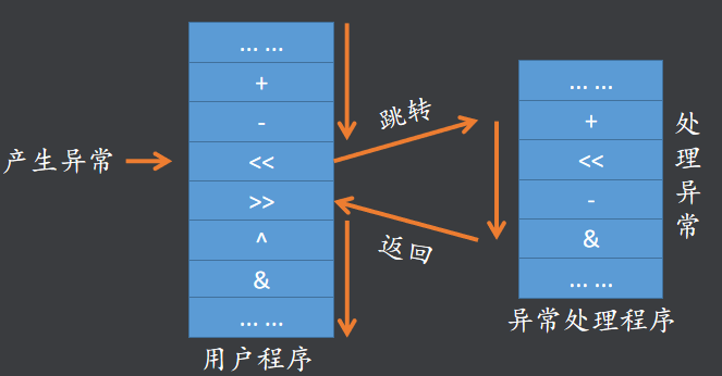 - 计算机中对异常的处理套路:异常产生时,CPU就要将当前的程序暂停下来转而去处理这个异常的事件,异常事件处理完成之后再返回到被异常打断的点继续执行程序