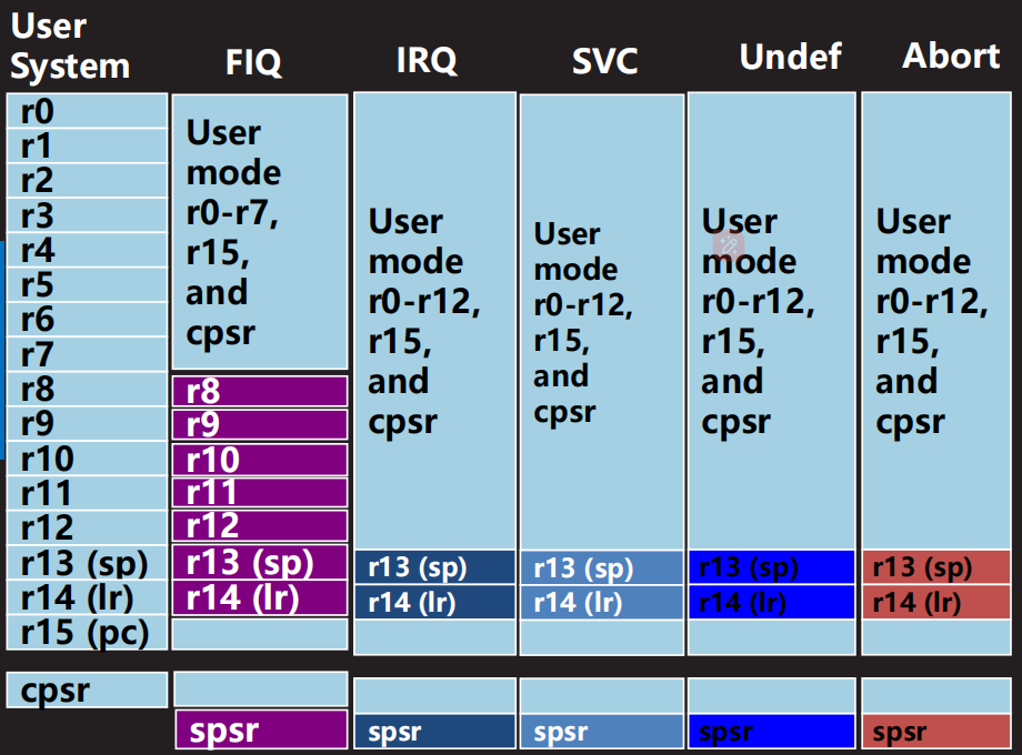 | FIQ (快速中断异常) | 硬件(DMA...)产生快速中断信号 | FIQ |