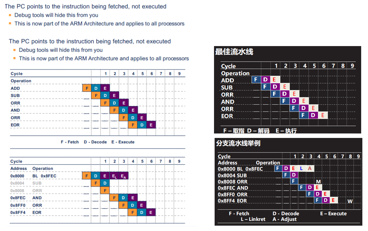 - 为了提高指令的执行效率,ARM汇编指令采用流水线的方式执行