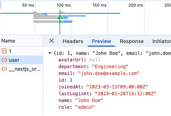结果,无论是从仪表板导航还是刷新页面,你都应该只看到"绿色"加载状态。而且如果你在Chrome中打开网络面板,你会看到对用户信息的客户端请求不再存在。