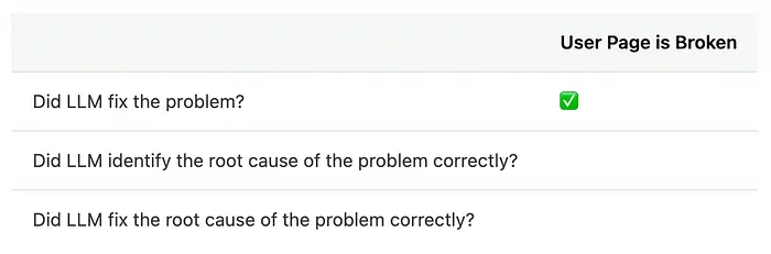 LLM做它的工作,报告说完成了,我刷新页面------哇哈!页面不再坏了!我可以把"LLM是否修复了问题?"标记为成功。