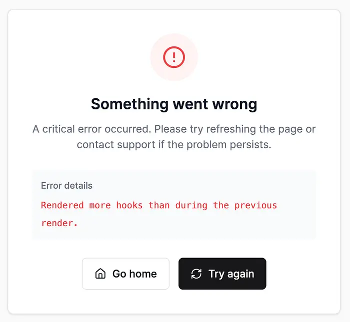 然而,错误不是预期的,需要消失。在浏览器的控制台中,我看到相同的错误:Rendered more hooks than during the previous render.