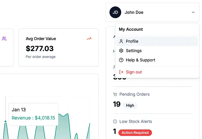 打开它,你会看到一个漂亮的仪表板页面。点击Order ID查看更详细的订单信息。点击Product ID查看产品更多信息。点击右上角的用户名会打开一个包含更多链接的下拉菜单。点击"User Profile"会进入一个显示用户所有信息的页面。