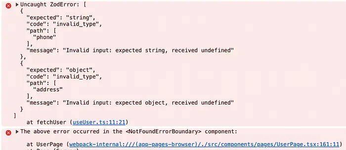 在UserPage组件触发的fetchUser函数中有一些Zod相关的问题。