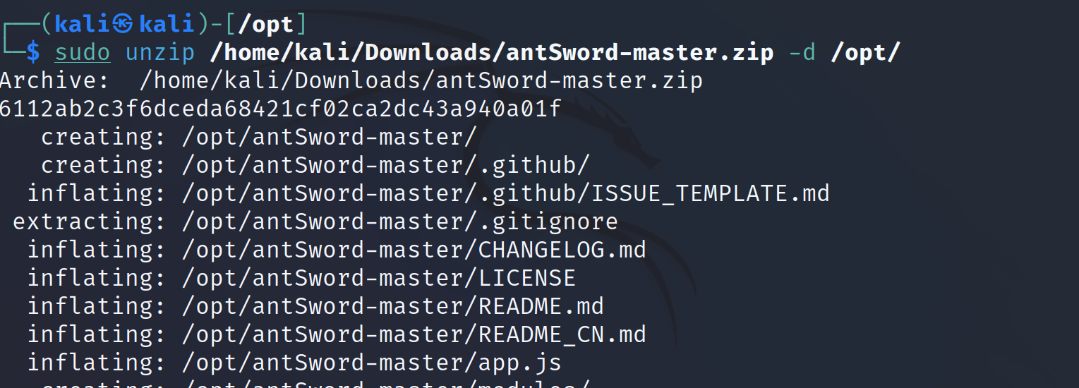 Step3。将下载的antSword-master.zip拷到kali-linux中/home/kali/Downloads目录下(本人爱好的临时资源存放路径,非固定路径),随后把这个压缩包解压到/opt目录下,解压指令为:sudo unzip /home/kali/Downloads/antSword-master.zip -d /opt/
