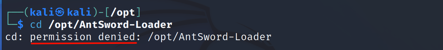 Step1。尝试进入加载器目录。kali给了一记大大的permission denied报错,其实这个报错的原因也很简单(前面解压的时候使用了 sudo 命令,导致 AntSword-Loader 文件夹的所有者变成了 root 账户。而我现在使用的是普通的 kali 用户,所以没有权限进入这个文件夹)