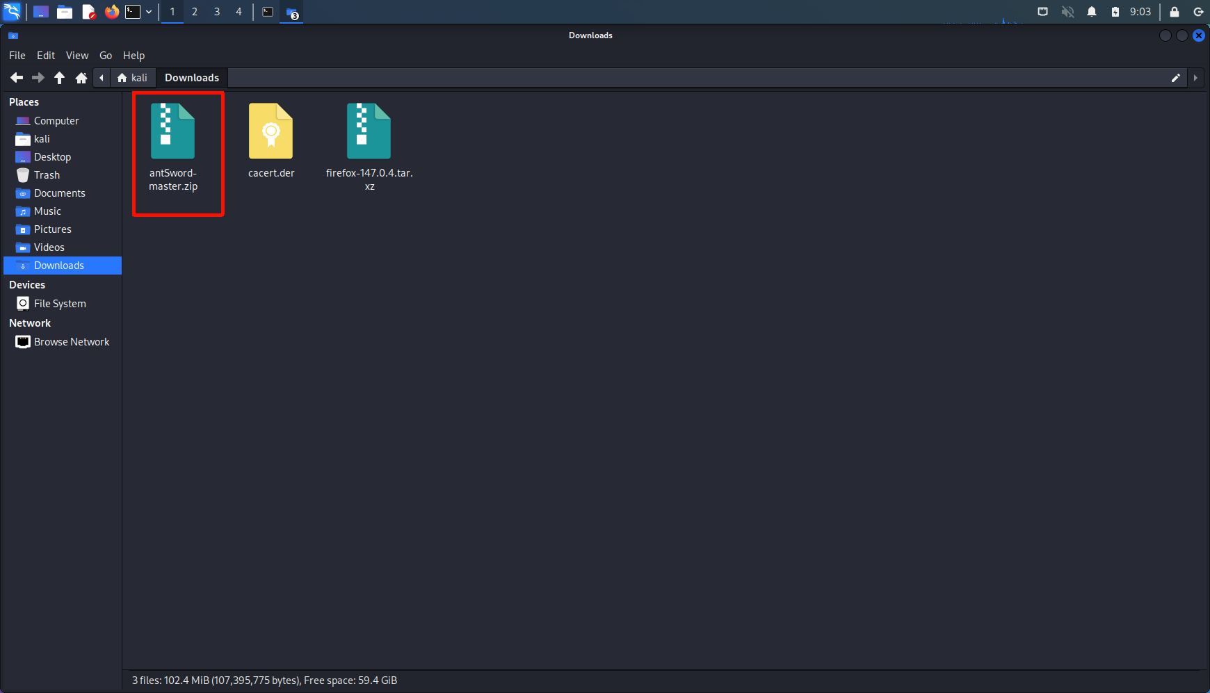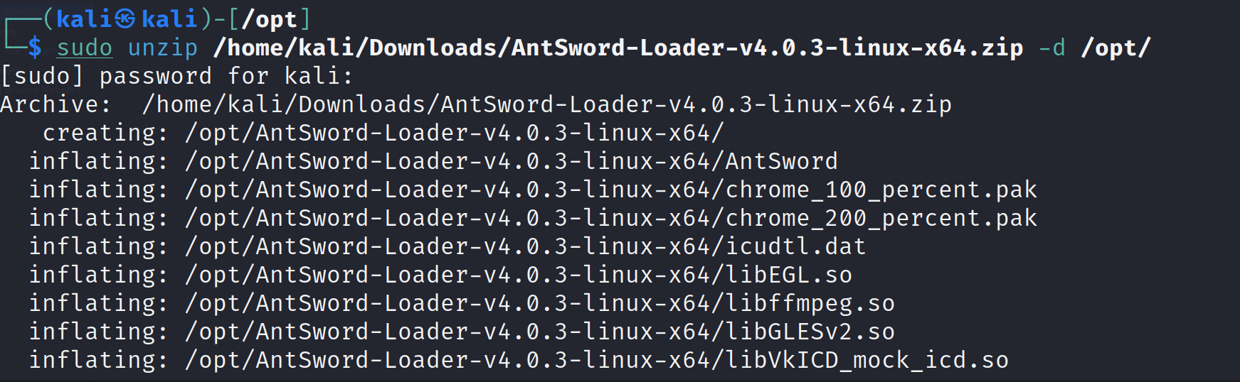 Step2。将下载的压缩包AntSword-Loader-v4.0.3-linux-x64.zip放到/home/kali/Downloads目录下,随后将该压缩包解压到/opt目录下。