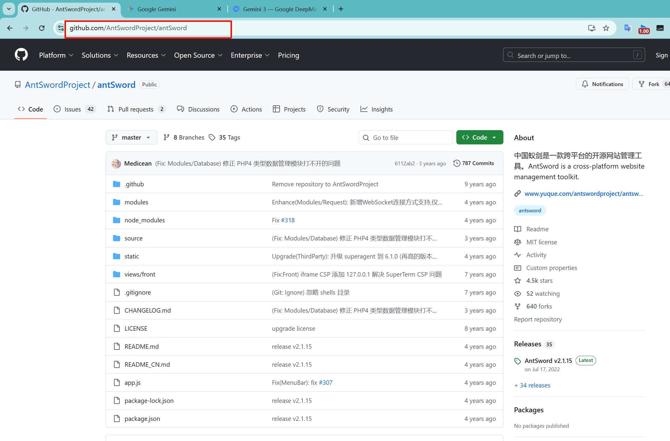 于是换一种下载方式。直接去github中把这个项目的压缩包下载下来,下载速度达到5M/s,很快就得到了一个压缩包antSword-master.zip。