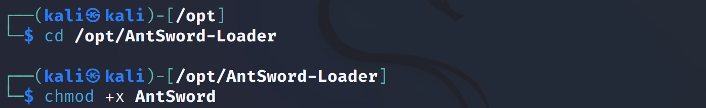 Step3。进入蚁剑加载器目录(AntSword-Loader),随后赋予蚁剑核心源码(AntSword)执行权限