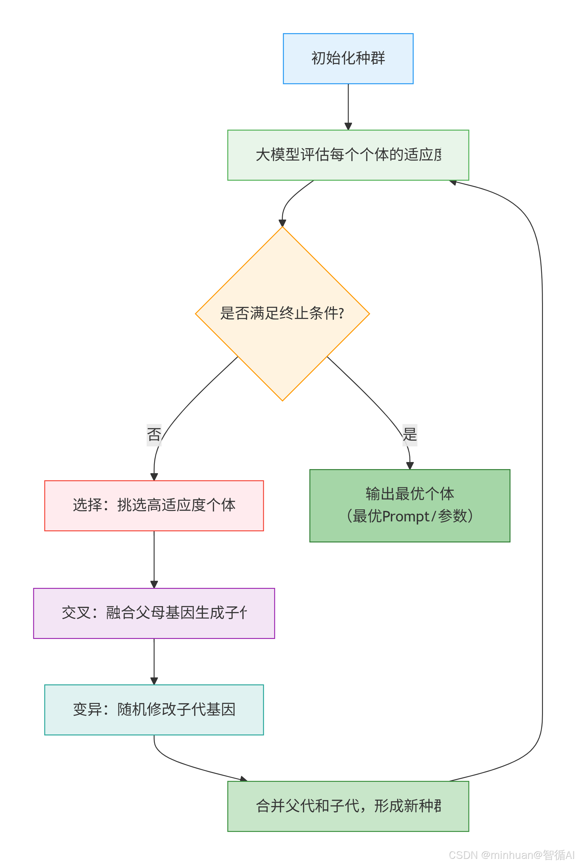 - **适应度评估器:**GA生成的每一个 Prompt或参数组合,都需要大模型执行生成任务,然后大模型(或辅助的评分逻辑)对生成结果打分,这个分数就是该个体的"适应度";