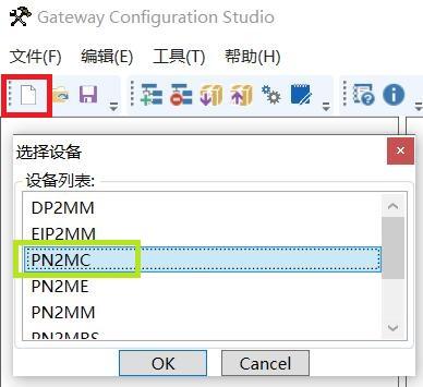 下载配置到PLC,打开Profinet转ModbusTCP网关配置软件进行modbus参数配置,点击红圈中的新建,选择PN2MC;
