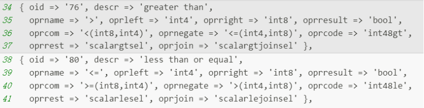 这里主要通过clauselist_selectivity函数计算join选择率和过滤条件选择率。对于join选择率来说,常见等值操作符为"=",使用join_selectivity->eqjoinsel 函数计算选择率(和inner join的选择率一样)。而过滤条件">"选择率使用restriction_selectivity->scalargtsel 。在此处,需要关注pg_operator.dat文件,该文件中注册了所有操作符元数据信息,包括OID和对应的操作函数,当然还有对应的选择率计算函数,比如>和<=操作符,它对应的选择率计算函数分别是scalargtsel和scalarlesel: