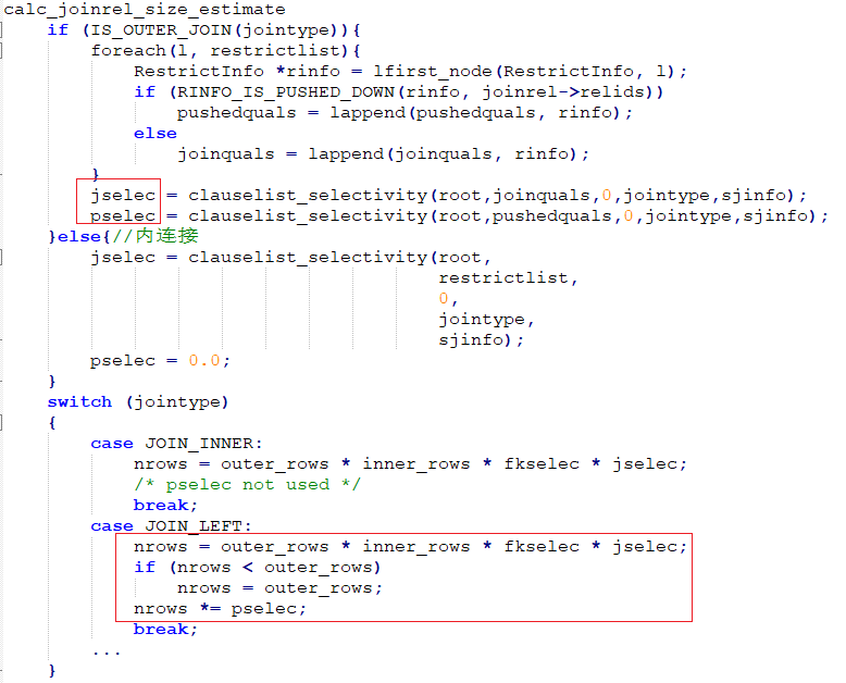 Inner join和left join以及full join的选择率是一样的。关于内连接选择率计算即eqjoinsel_inner函数见:PgSQL的等值inner join选择率