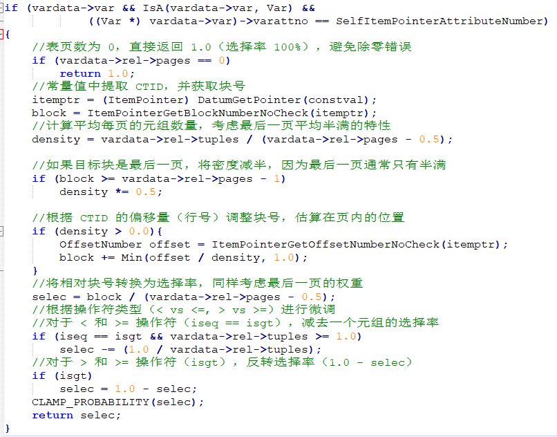 如果Var是CTID 则特殊处理:基于表页数和元组密度计算选择率,否则使用默认选择率:返回 DEFAULT_INEQ_SEL(0.3333333333333333)。CTID的选择率计算如下图所示: